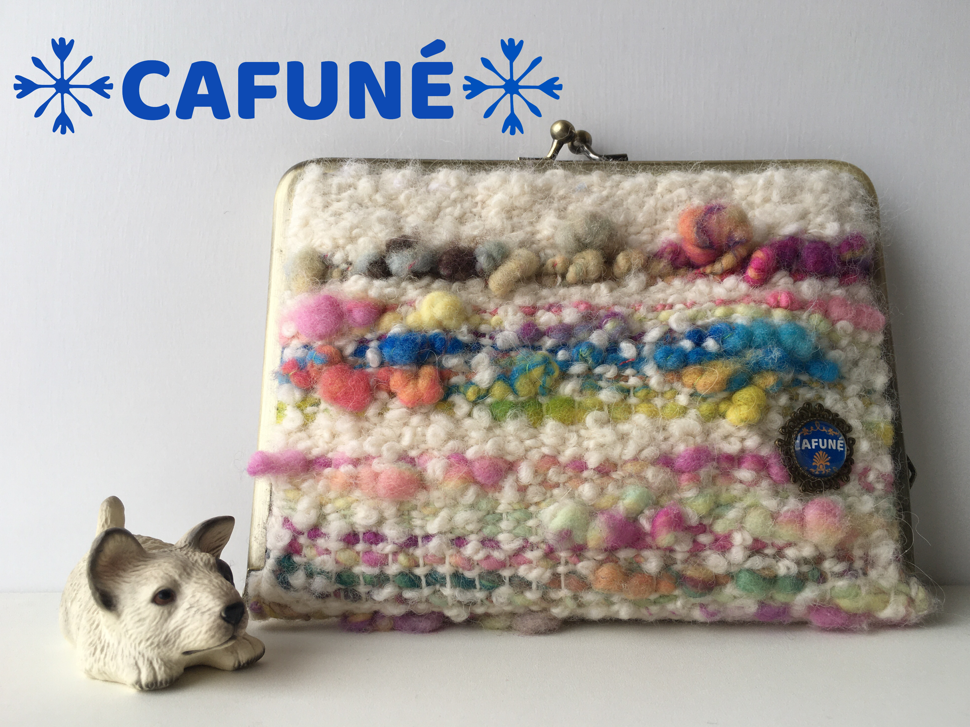 手紡ぎ糸とループヤーンで織ったがま口ブックケース Cafune